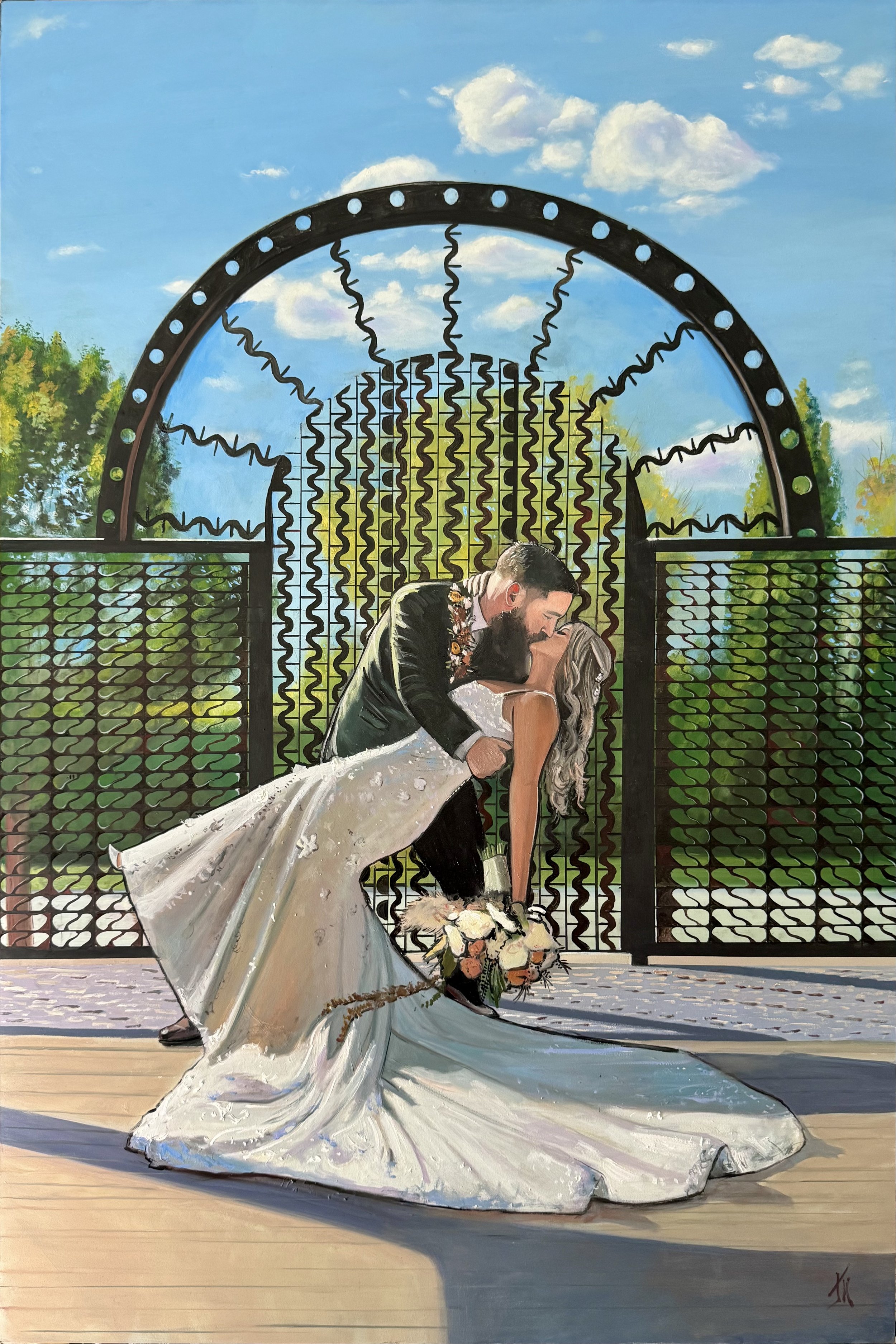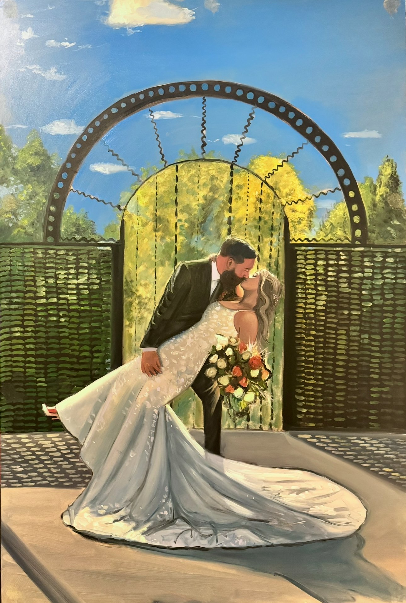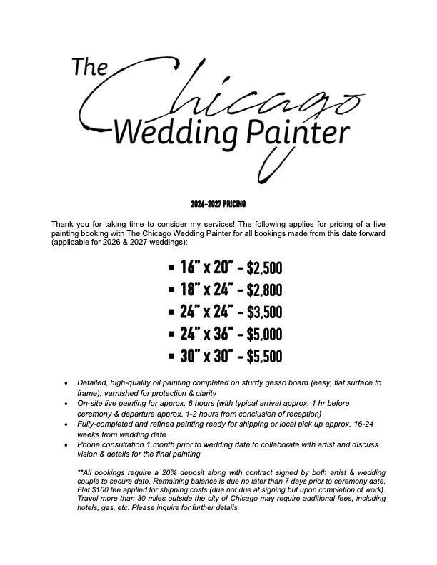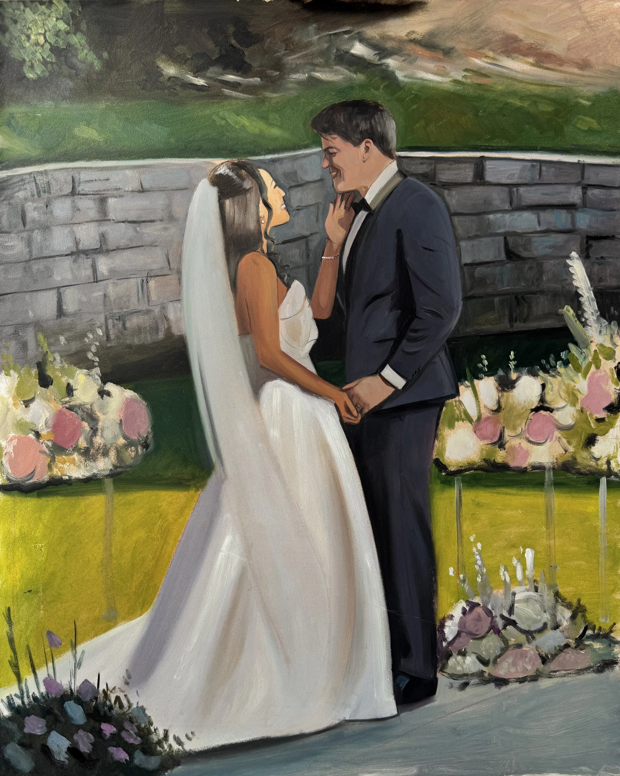 A live painting will see me arrive, set up, attend the wedding (depending on the moment we discuss), and begin my work during the cocktail hour/reception. I am typically on site for an average of 6 hours, allowing me to achieve a roughly completed painting to present by the end of the evening!